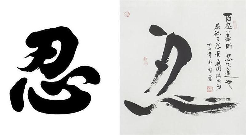 Bên trên là chữ Nhẫn gồm chữ Đao (刀) với 1 điểm (刃), bên dưới là chữ Tâm (心).